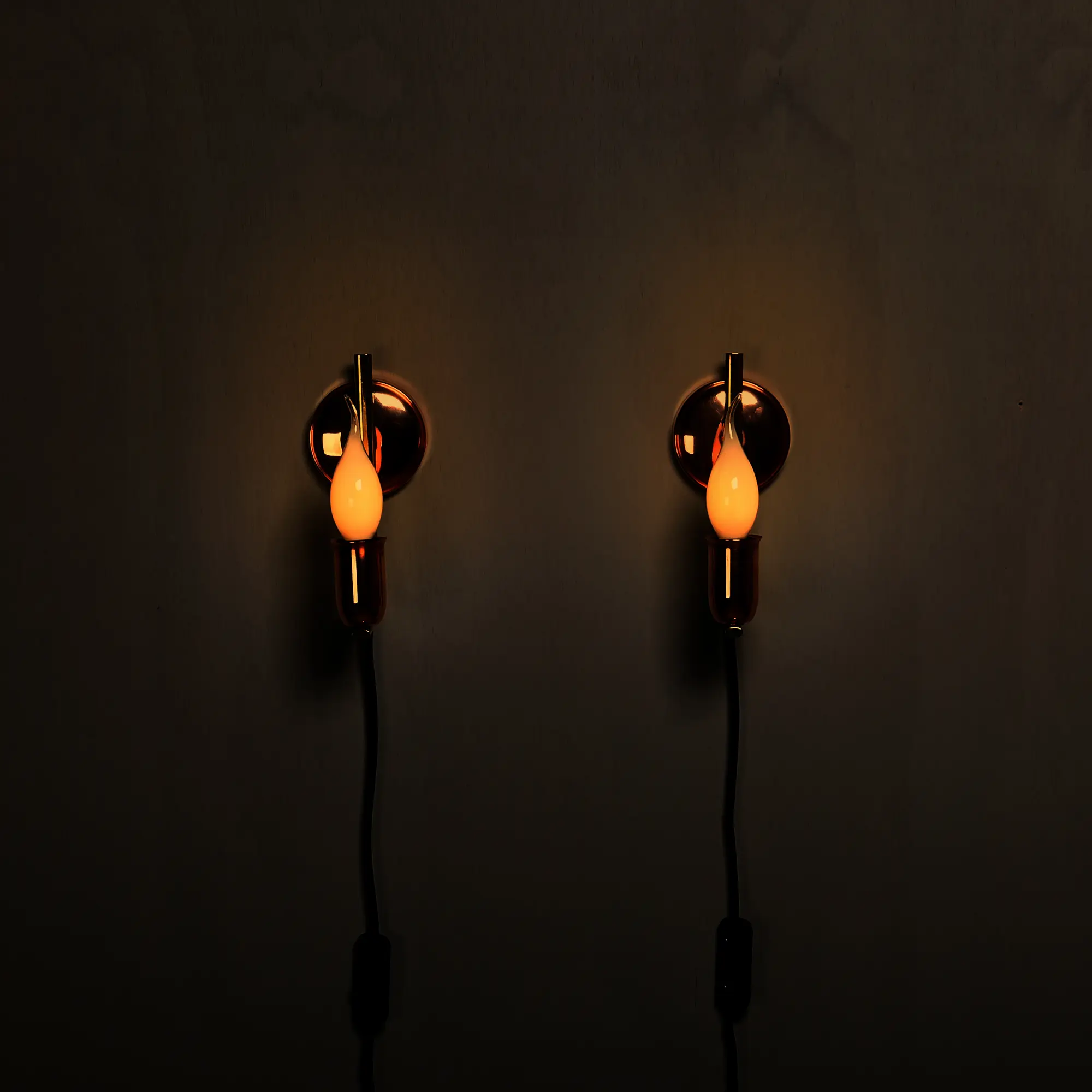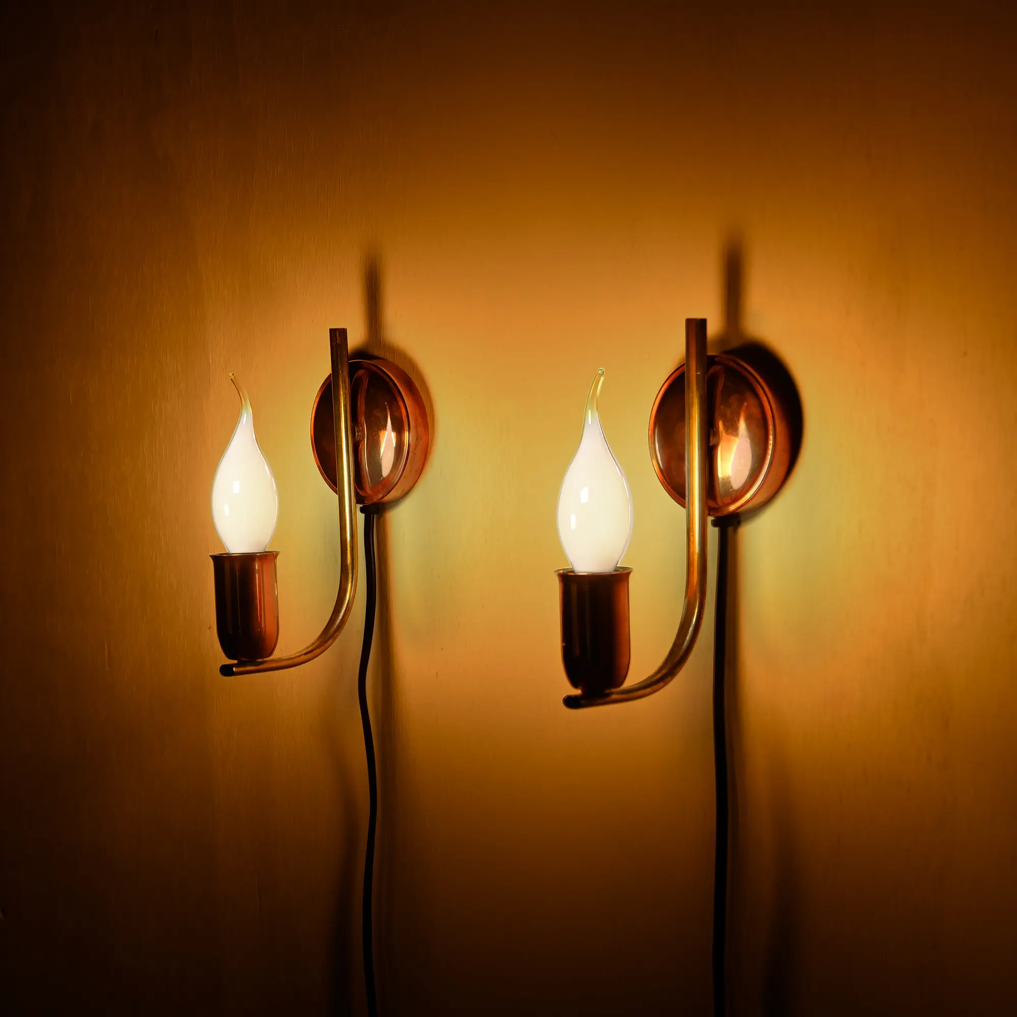 A beautiful pair of vintage wall lamps produced in Denmark in the 1950s. Copper bases and lamp holders are connected by an elegantly curved brass connection. In very good condition, the metal parts have been polished and the lamps rewired. The lamps can be used with either a cord (EU or US plug) or hard-wired.